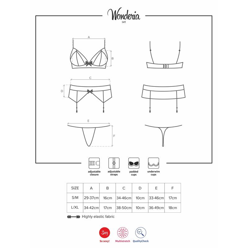 - Incluye: sujetador, tanga y liguero